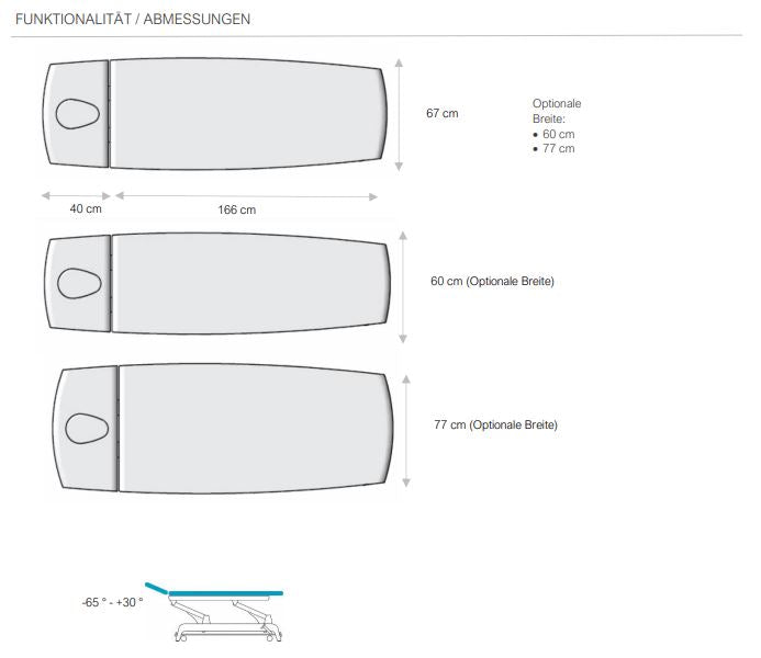 anhand einer Therapieliege gymna.PRO D2 mit einteiligem Kopfteil, welches -65° bis +30° verstellbar ist. Die Behandlungsliege ist in verschiedenen Breiten erhältlich.