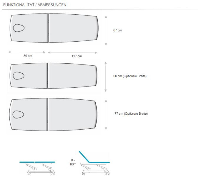 anhand einer Therapieliege gymna.PRO D1 mit Rückenteil, welches bis 80° angestellt werden kann. Auch das Modell ist verschiedenen Breiten verfügbar.