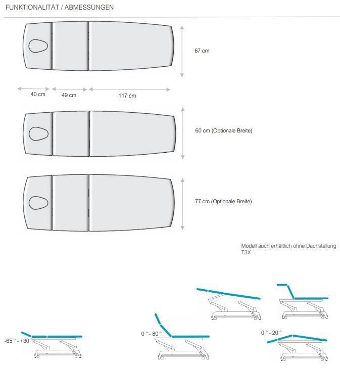 anhand einer Therapieliege gymna.PRO T3 mit zahlreichen Verstelloptionen (z. B. Dachstellung 0°-20° oder Rückenverstellung 0-80°)
