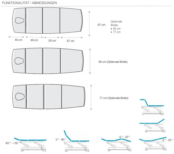 Therapieliegen sind mit Liegeflächen in verschiedenen Teilungen erhältlich. In der Regel sind grobe Liegefläche-Teilungen zwischen 1 bis 4 Teilelemente erhältlich. Welche Teilung Sie für Ihre Praxis benötigen, ist abhängig davon, welche Behandlungen Sie durchführen möchten oder welchen Wert Sie auf den Komfort Ihrer Patienten legen.